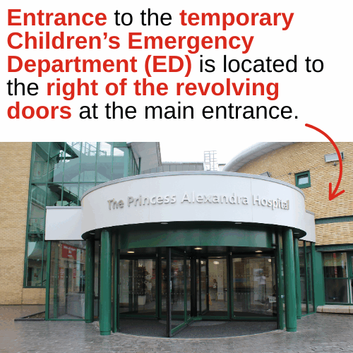The entrance to the temporary Children’s ED is located to the right of the revolving doors at the main hospital entrance as pictured (right).
